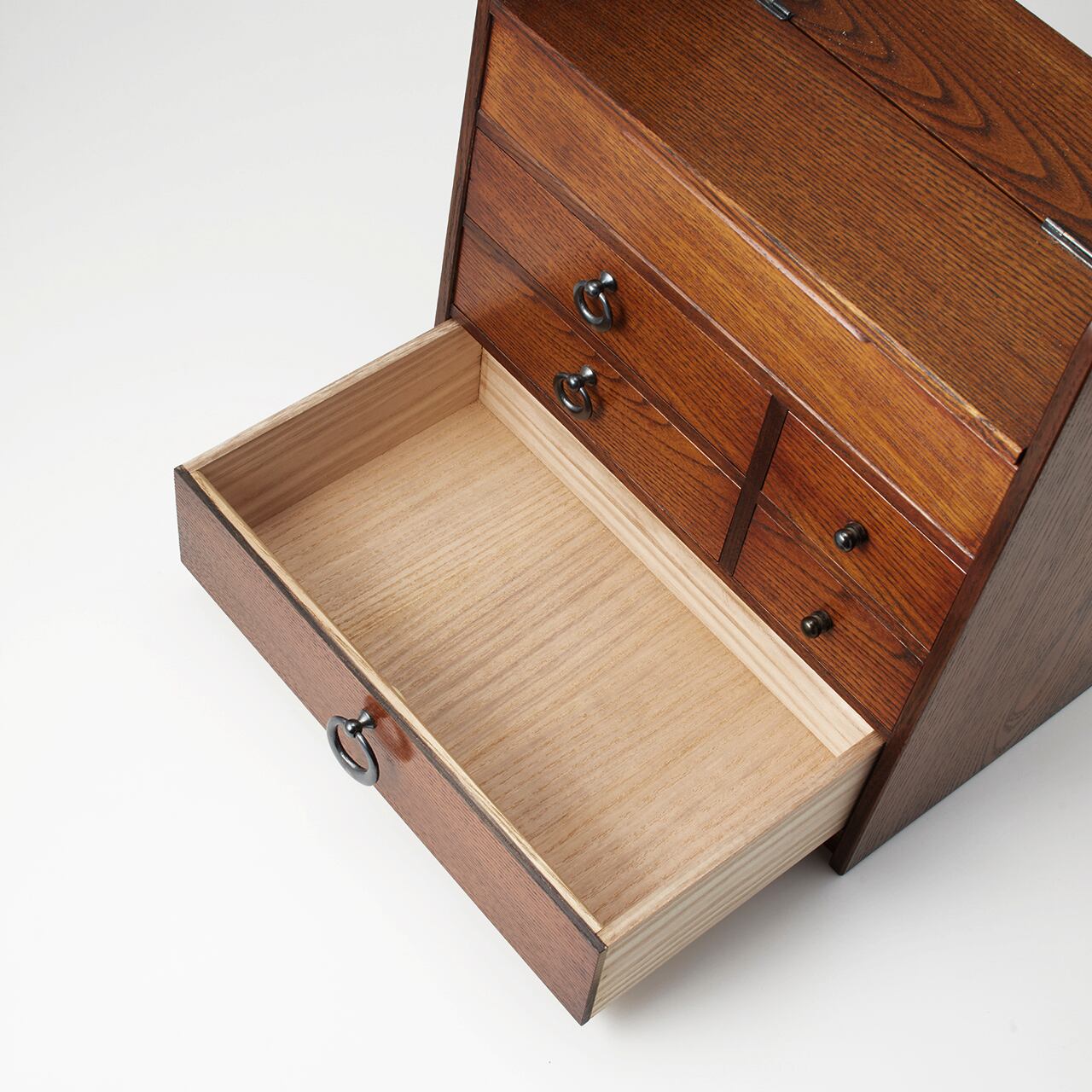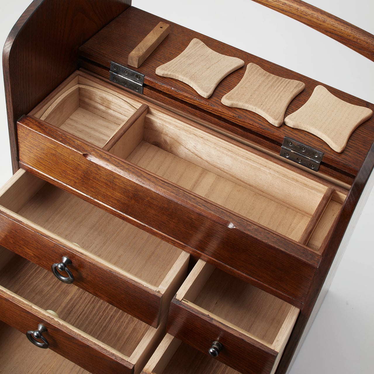 蓋を開けると、きめ細やかな仕切りが小物を美しく整理。針箱としてはもちろん、アクセサリーや文具、趣味の小物入れとしても最適です。机上に置くだけで和の趣を演出し、上品な空間を創り出します。